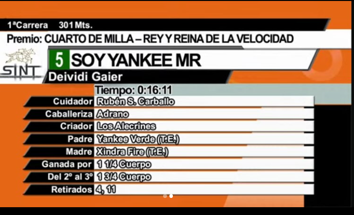 Hoje, SOY YANKEE MR, criação de Marcelo Rocha, filho do consagrado garanhão YANKEE VERDE AAAT 106 (em Xindra Fire), vence o GP Rey e Reina de la Velocidad com tempo recorde nos 301 metros! 🏆⚡