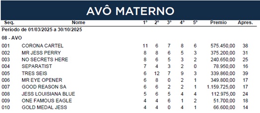 NO SECRETS HERE é o terceiro melhor AVÔ MATERNO, apenas atrás dos poderosos CORONA CARTEL e MR JESS PERY: