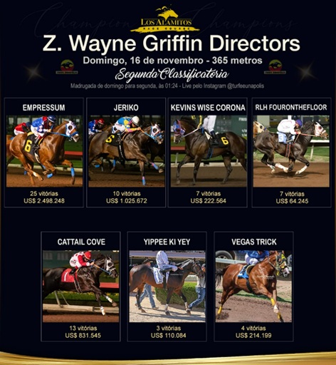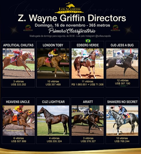 Domingo, EDBERG VERDE, corre o Z. Wayne Griffin Directors (365 metros) em Los Alamitos. São 15 cavalos excepcionais, divididos em dois páreos, com bolsa de US$ 20 mil dólares cada, disputam as últimas duas vagas para o Champion of Champion de 2025. Os dois melhores tempos entre os 15, vão a esta final.