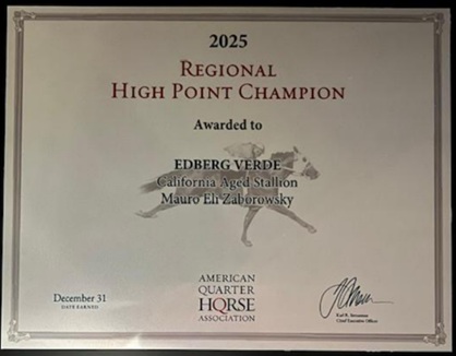 Colecionando títulos: EDBERG VERDE, agora recebe a placa de: 2025 Regional High Point Champion